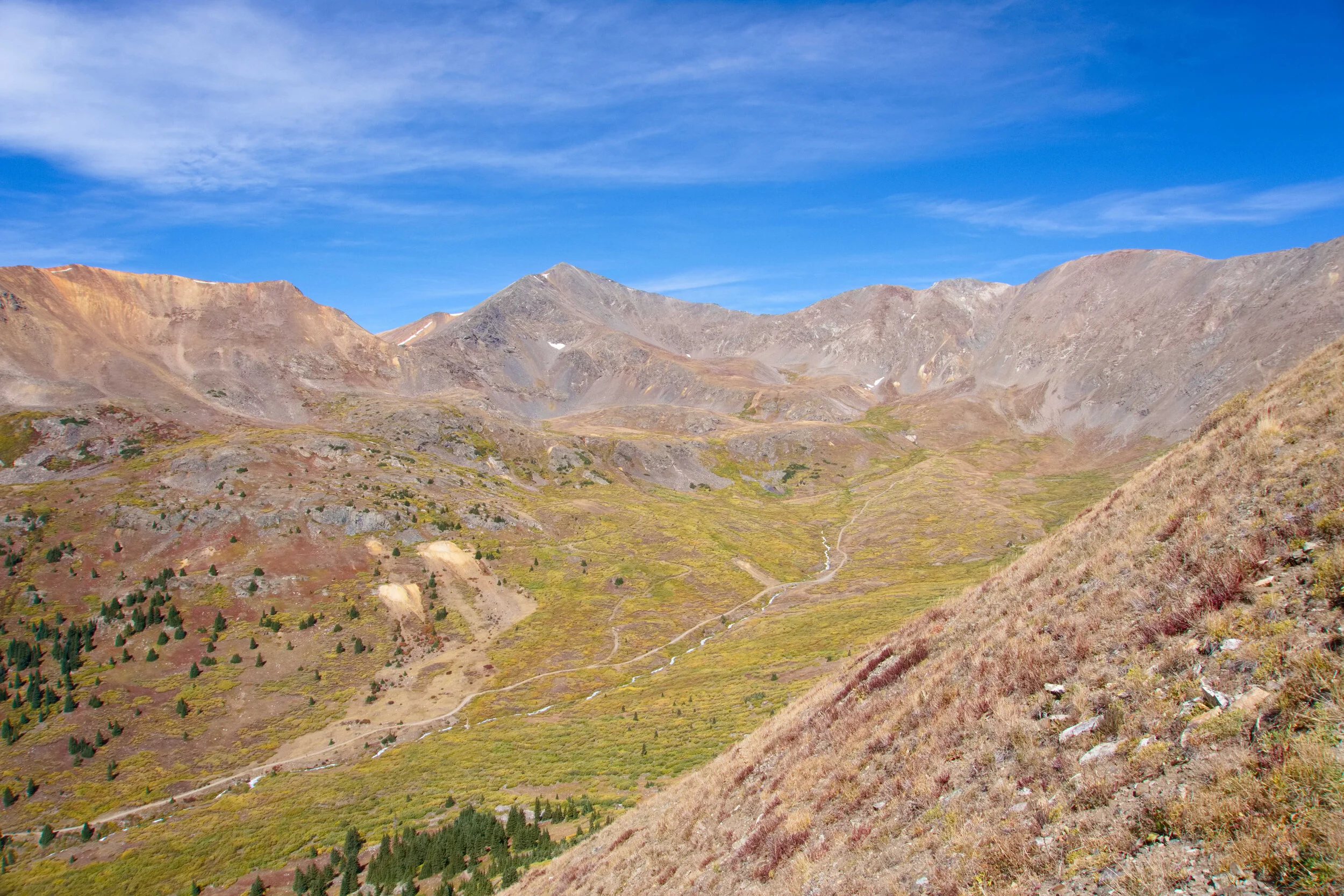 I slept in until 8 because I had such a tiresome bit of night hiking. There were a lot of campsites and decaying cabins along the primitive road and after a mile or so I saw the remains of a massive 3-story mill, part of the abandoned Pennsylvania Mine. I couldn’t pass this up so I hopped across Peru Creek and got my feet wet cutting across a marshy area. I took tons of photos and videos and loved the aesthetic of this place. When I left, I realized there was a nice gravel road and bridge I could have taken and kept my feet dry, oh well. The trail looped around a huge bowl to the South of Grays Peak (the highest point on the entire CDT) and various mining remains dotted the landscape. It got windier and windier as I climbed up and got to hike along another sketchy knife-edge ridge.