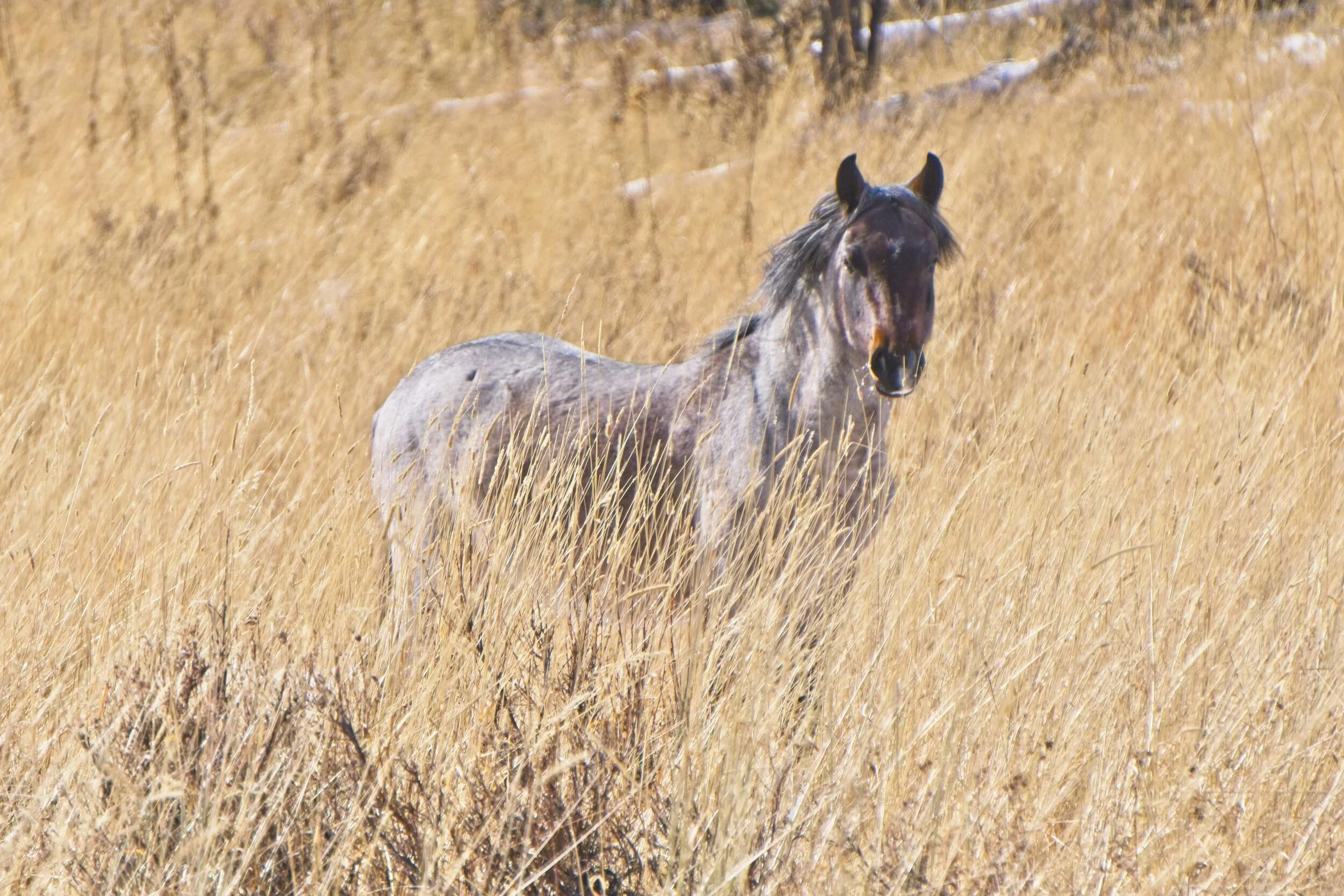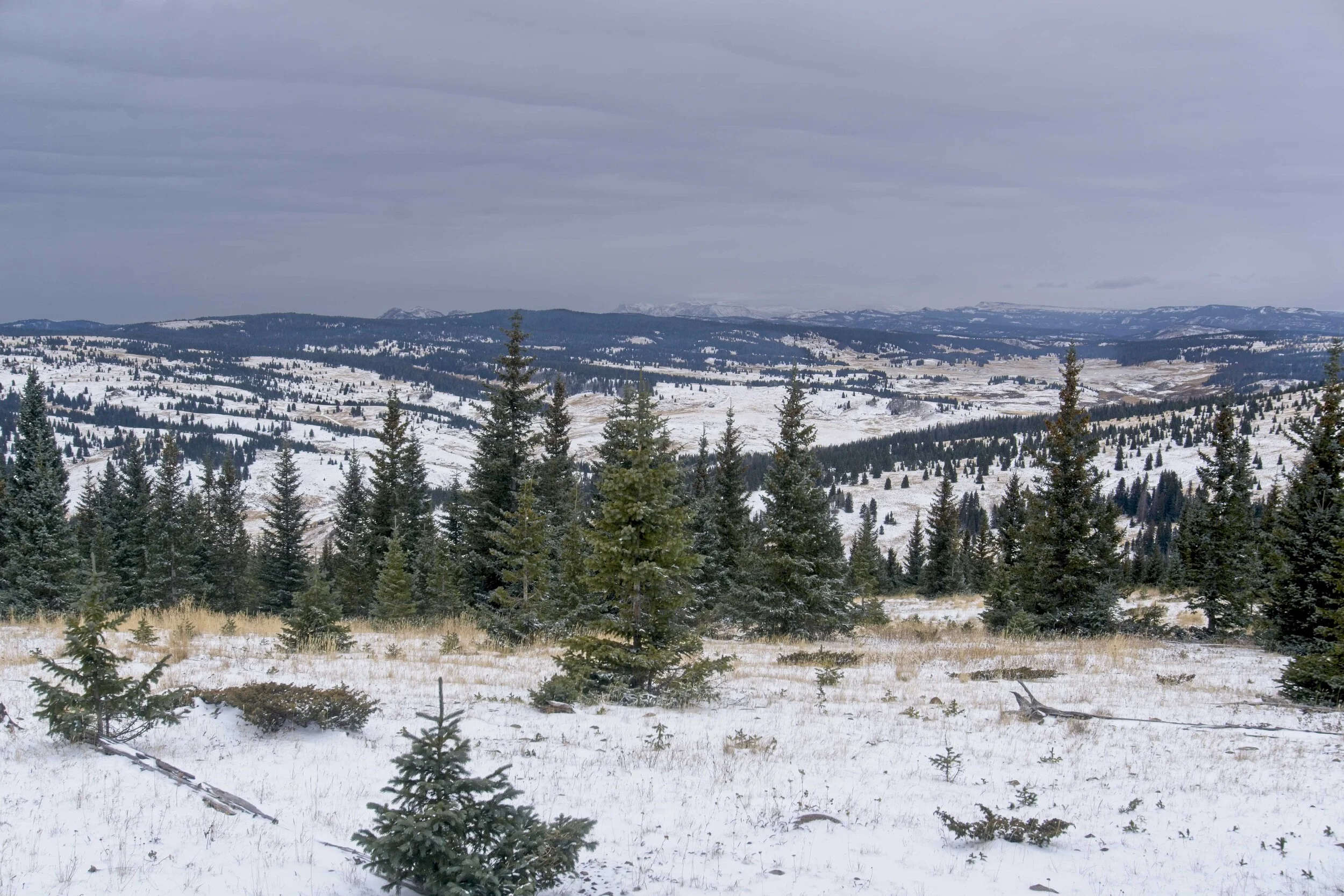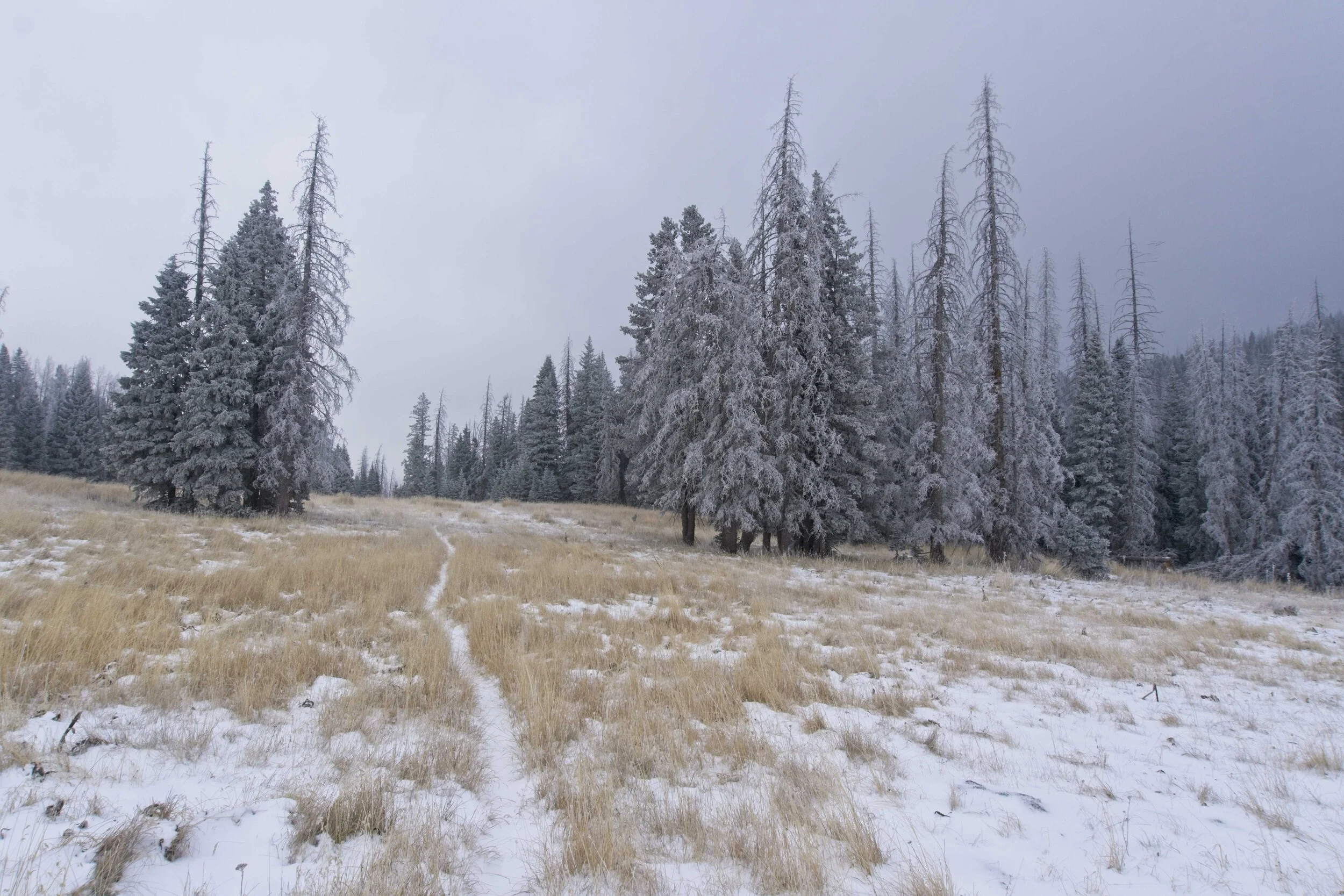 After some terrible sleep, I woke up around 730 to find that wind hand blown snow under my tarp and all over my shoes and pack. I grumbled to myself and managed to get back to sleep for about an hour and next time I woke up, it was snowing. I checked the weather on my Garmin and found it was going to keep snowing and keep getting colder throughout the day, bottoming out at -3°F. I debated sending a text to Sea Lion and have her drive up to come rescue me. It was unbearably cold. I cooked breakfast in bed and discovered that a rodent had chewed into my food bag. Luckily the little bastard only nibbled on one Oreo before leaving. It took a lot of fortitude to get myself out of bed, squeeze my feet into my frozen shoes, and pack up camp. Again, my fingers froze as I wound up my cords and packed things away so I had to take breaks to do jumping jacks and tuck my hands into my arm pits for warmth. I saw that over the next seven miles, I dropped 2,000 feet in elevation and that should be enough for the weather to be drastically warmer. I wasn’t hiking until 10 but it felt amazing to get my blood moving. I got to a small meadow and there was a big animal standing in the middle. I thought it was an elk but after switching to my zoom lens I saw that it was a horse. No saddle, reigns, or ear tag, so I wondered if it was a wild horse. We stared at each other curiously for a bit before I started to get cold again and kept hiking.