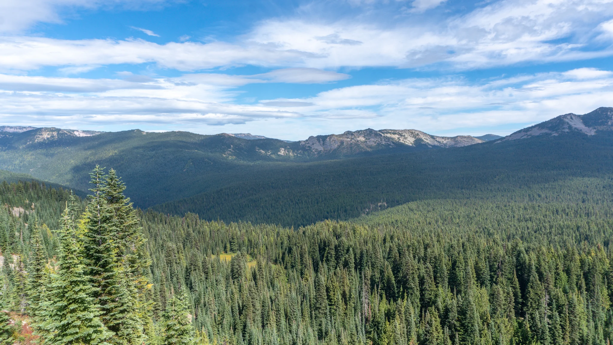 It was again cold in the morning but the rain continued to stay away and the clouds clear out. We got packed up and kept hiking north. We soon got to the bottom of the hill where Lava Spring resides. A strong flow of ice cold water bubbles out from under a huge pile of lava rocks and it was a great spot for second breakfast. The terrain for the rest of the day was pretty easy, gentle ups and downs and the blue skies returned. We entered the Goat Rocks Wilderness which we've heard was one of the most beautiful sections of the whole trail. The deeper we went into it, the more I agreed. There were endless hills carpeted with green trees, rocky cliffs, and colorful brush. Towards the end of the day we were on a ridge with one of the last views of Mount Adams and it was wearing a big cloudy hat. We got camp set and I captured a time lapse of the sunset.