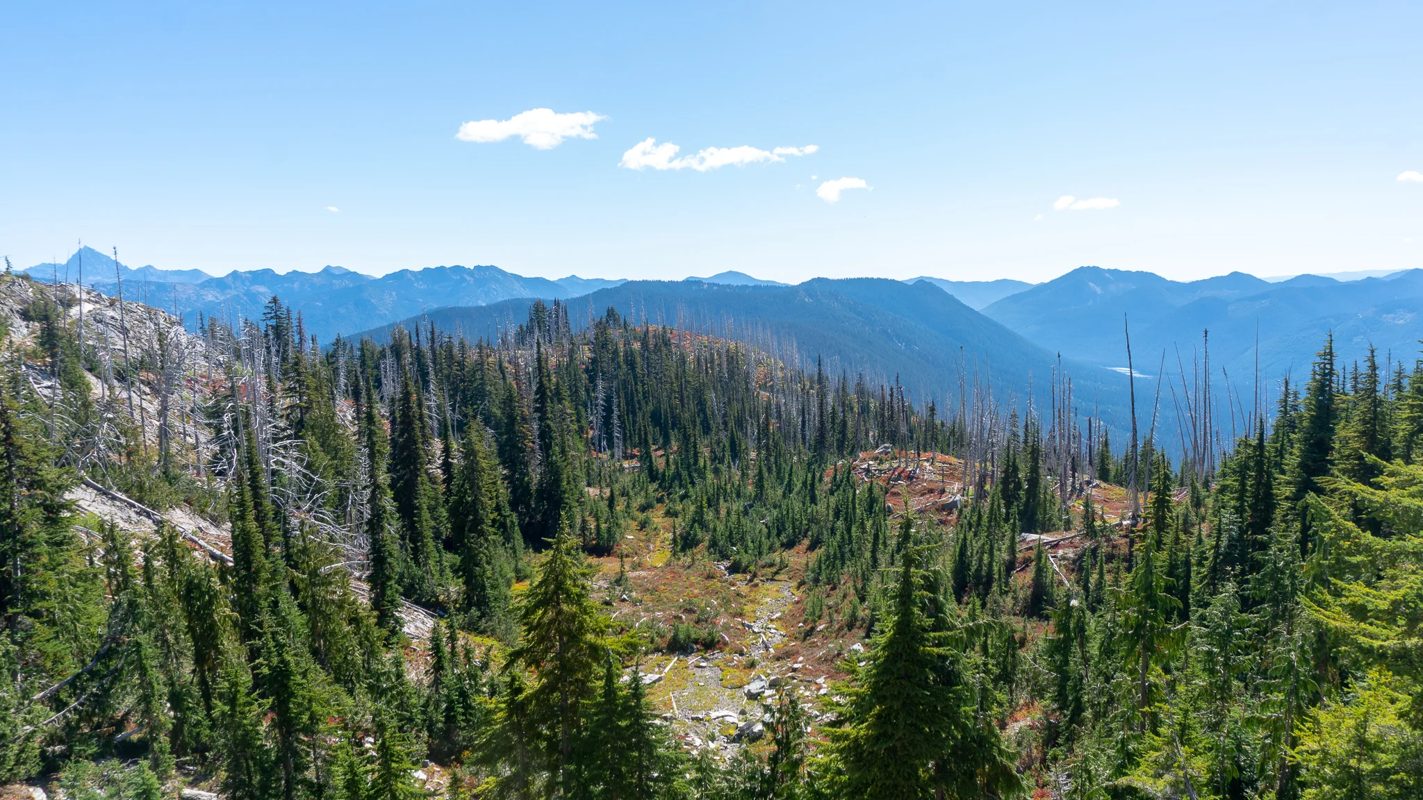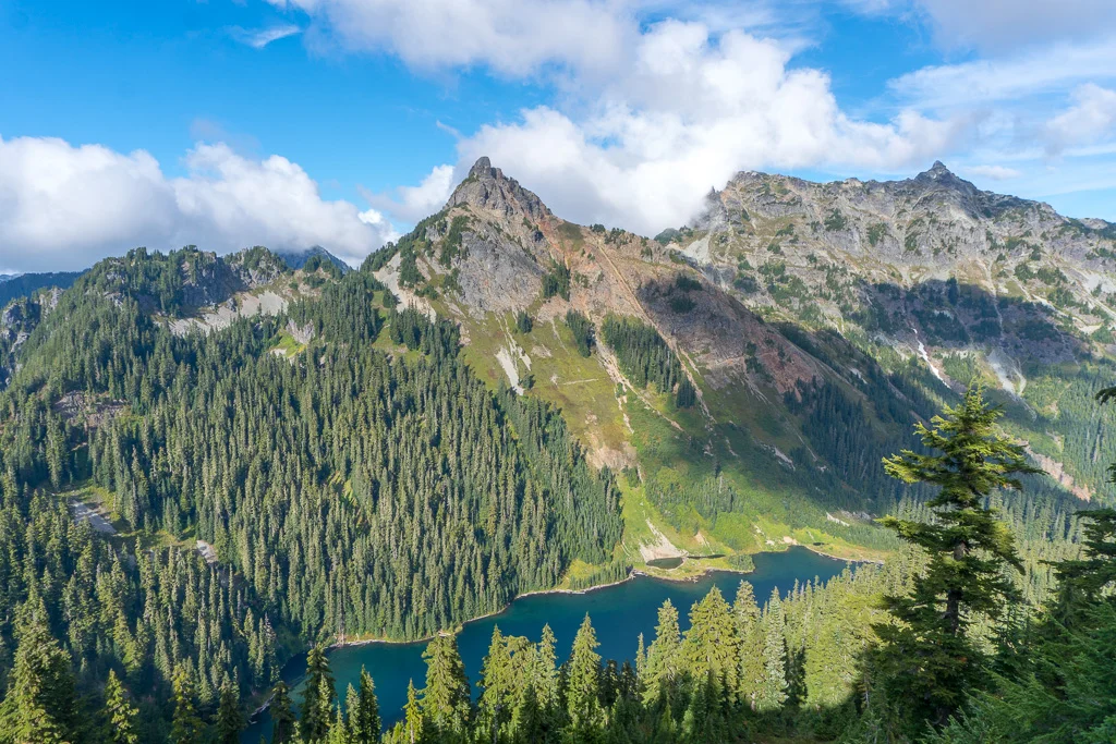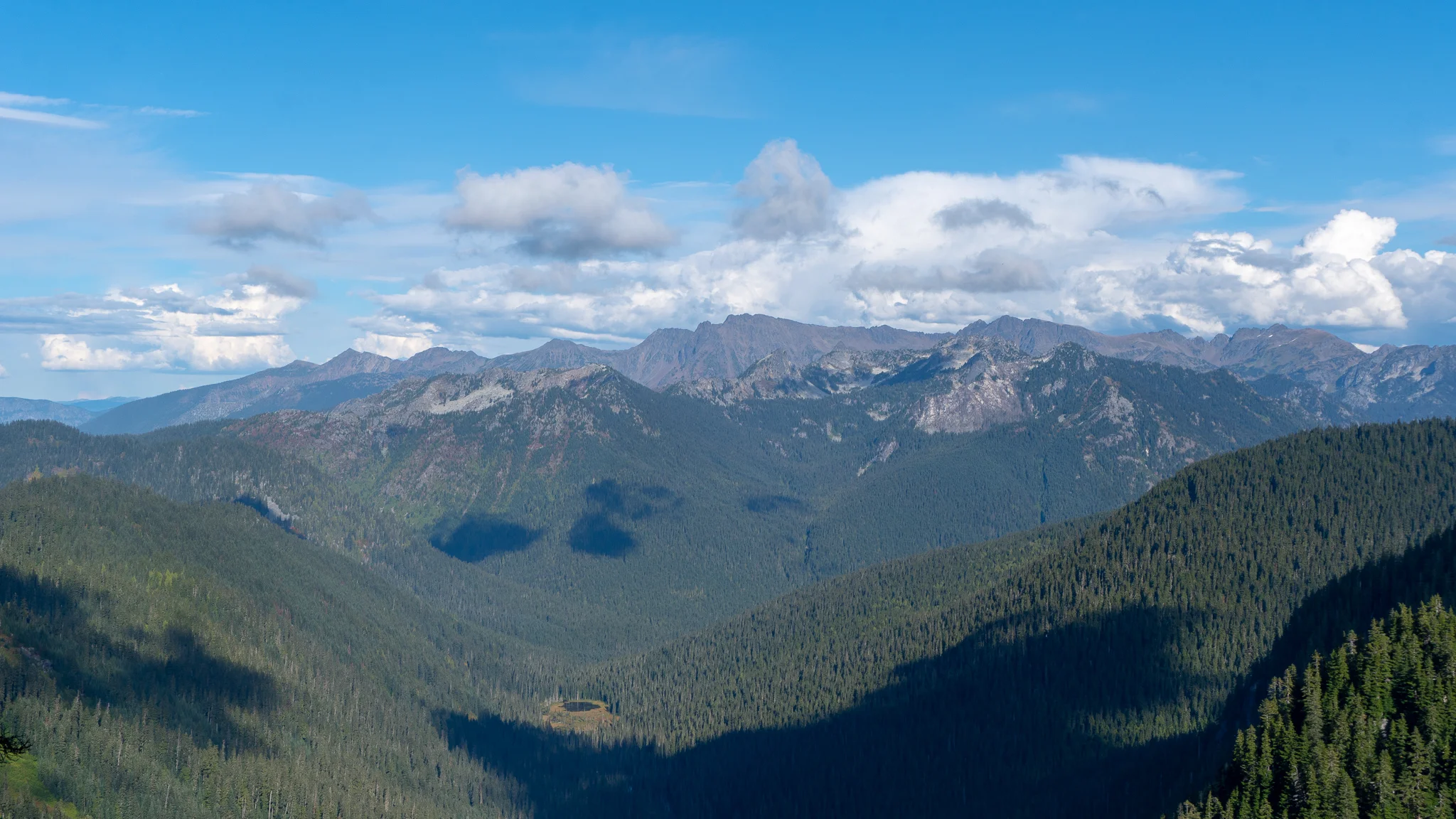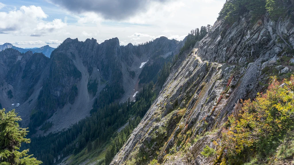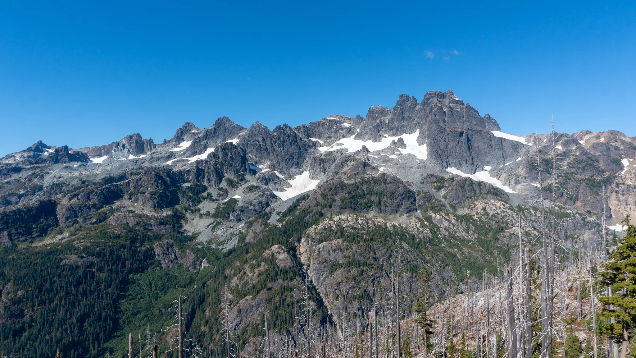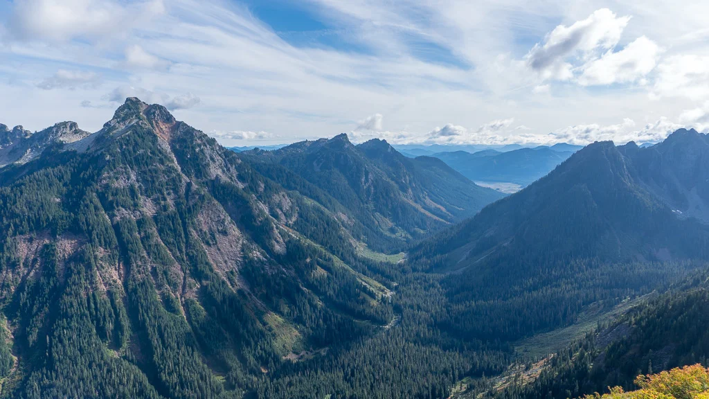 We had a decently early start to the day so we could finish off the climb and our hypothesis was correct, tons of hikers were camped at the top, near Cathedral Rock. It was also freezing cold at the higher elevation so they all slept in and we flew by. On the next drop, a thick fog hung in the valley of Deception Creek and a few peaks were popping out in the distance. The trail followed the creek upstream for awhile before arriving at Deception Lakes which had crystal clear water and a nice little jumping rock. It was warm and sunny and I thought this very well may be my last chance for a dip on the trail. The water was still pretty chilly but when Sea Lion caught up we were going to explode our packs to dry things out in the sunlight so I decided to take a double dip. From there it was a steep hike up and over Piper Pass and along the way I found a nice and tall rock formation to climb with a chimney slot at the top. I also thought it may be my last chance on the trail since most rocks in Washington are covered in moss or constantly damp. So up I went and it got sketchy. I thought I tree’ed myself at the top, when you can’t find handholds to climb up but you also can’t climb back down. It was my only climb where I was scared because it was a good 25ft down and I almost got stuck at the top, just one move away from finishing. I finally found a good grip and topped out right before Sea Lion caught up and was amazed I was up there. At the top of the pass, we ran into friends and took yet another break to soak in the amazing views of Terrace Mountain to the West and Glacier Lake down below us to the North. One friend, Pizza, was doing a “Pizza Challenge” of his own creation: eat nothing but pizza for an entire section of trail. He packed out three XL pizzas and had been eating them for every meal. Since rain was coming, we wanted to get close to Steven’s Pass so we would have an easy day to get to town tomorrow. This meant we had to start crushing some miles and that is tough to do when the views consistently impress. We were aiming for Lake Susan Jane before dark but I stopped at Mig Lake because I thought it had a good angle to catch sunset. Sea Lion hiked on while I set a timelapse and ate dinner. The timelapse did not turn out well, we were too far down in a bowl and the clouds never popped. Pickle Pacer and I night hiked over the final three miles up and down a steep bit while we talked about politics and Bitcoin. I located Sea Lion and was ready for bed right at hiker midnight (9PM).