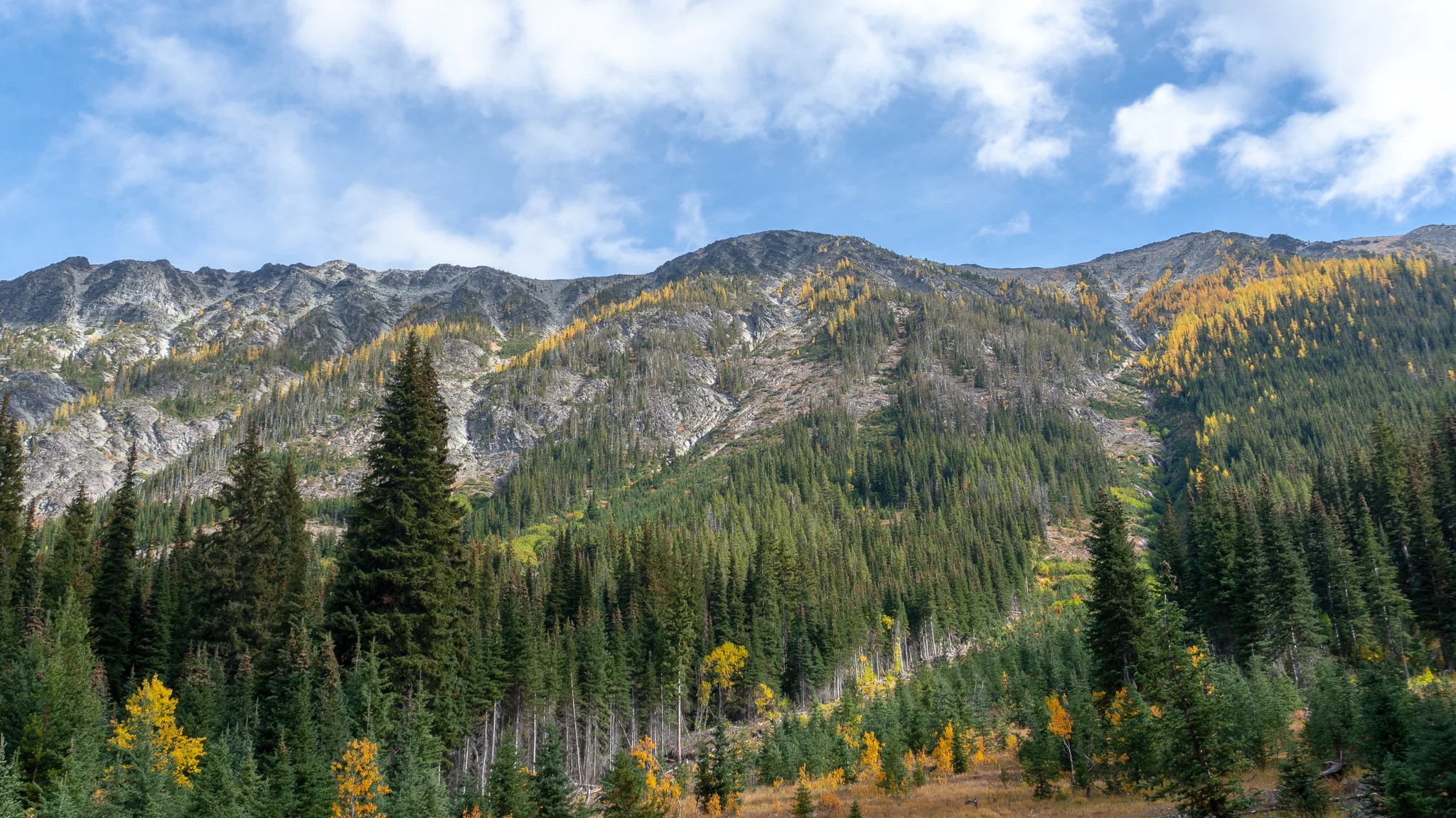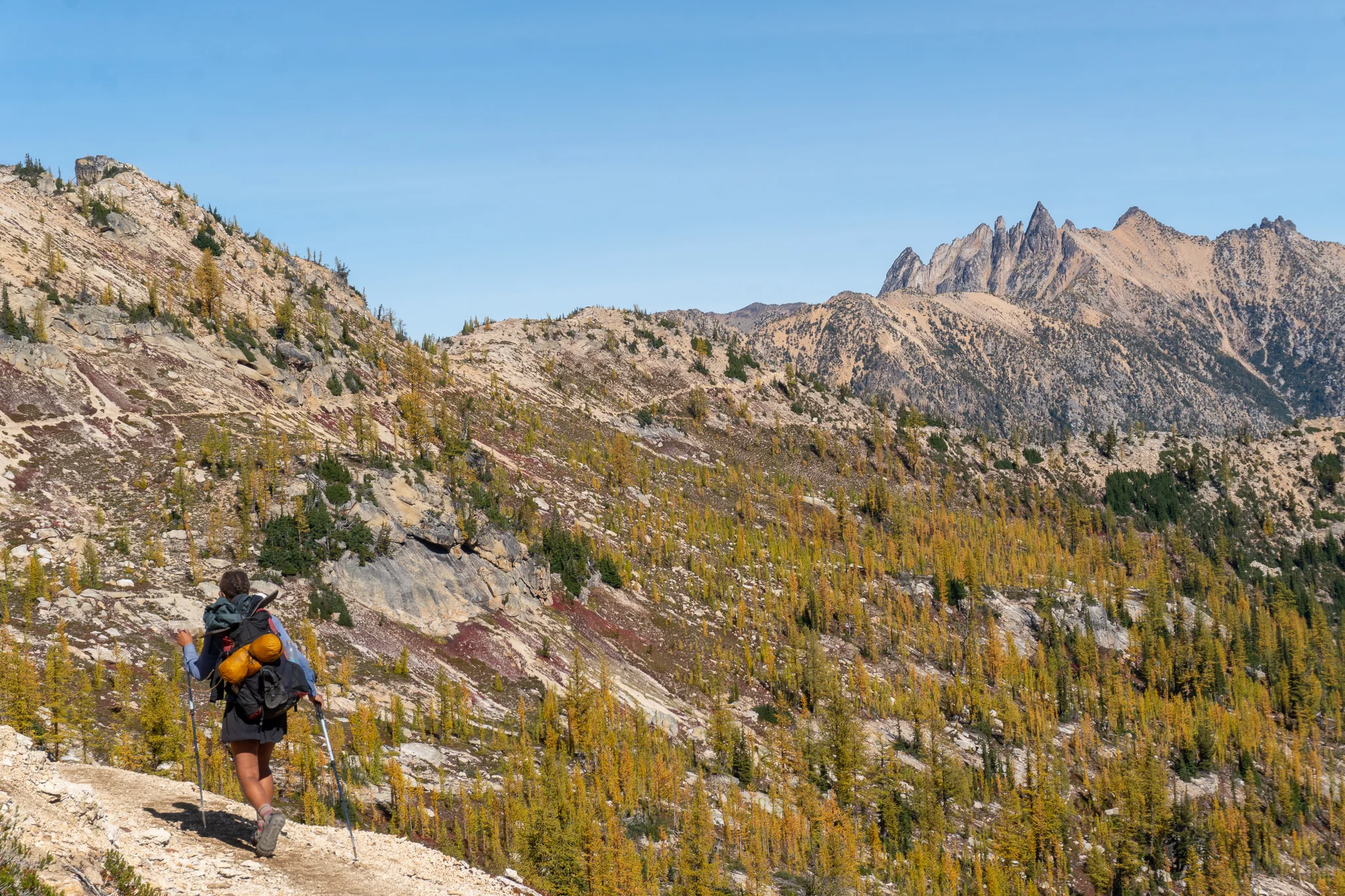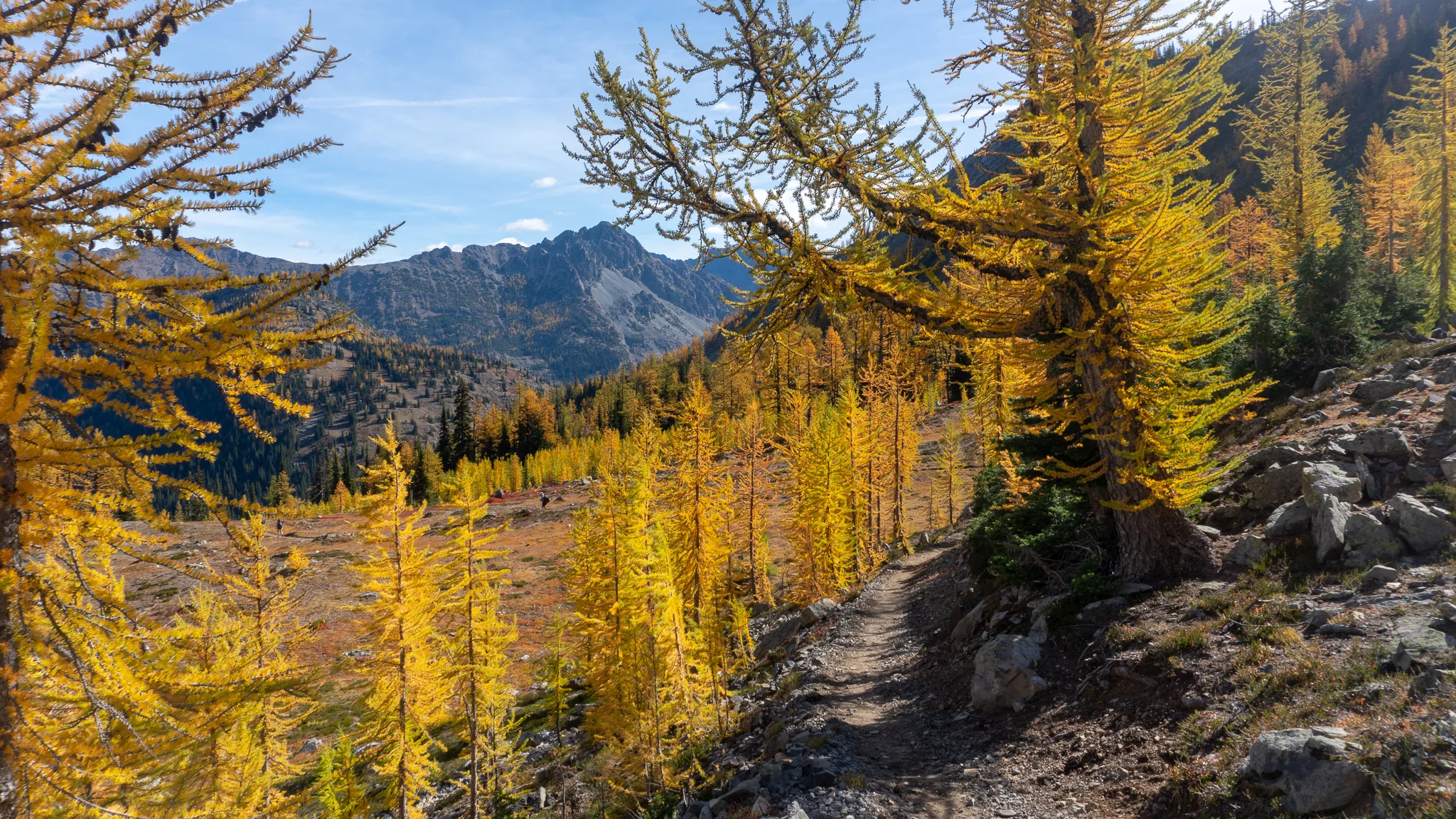 A bunch of trail maintenance volunteers began to hike past our camp en route to work on a footbridge and were carrying all sorts of axes, tools, and lumber. I was a little jealous because playing in the woods and building stuff are two of my favorite things and they got to do both all day! At least my biscuits and gravy Mountain House and buttered english muffin for breakfast helped me get over it. We crossed yet another log footbridge and soon arrived at Rainy Pass where there was a super anti-everything sign. It must have said “NO” at least 100 times. The parking lot was packed with day hikers, campers, and there was a huge Mercedez army truck that looked like an awesome van-life rig. I wanted a tour but it seemed like they were still sleeping. We blasted up a big ascent to Cutthroat Pass and stayed there for lunch to soak in the scenery. There were beautiful peaks all over the place. Some equestrians chatted with us for a bit and congratulated us on finishing the trail before we continued on. The path went around some ridges before dropping down a set of switchbacks next to a huge valley with Tower Mountain and Mount Hardy standing on the far end. The autumn colors continued to blow my mind and were so bright and vibrant they almost hurt my eyes if I stared for too long. We crossed the 2600 mile markers (there were four of them) and couldn’t believe we had crossed our final century marker. We reminisced about the time, 136 days ago, when we crossed mile 100 in the hot desert and had a dance party to celebrate. Oh how far we’ve come! We continued down the drop to Methow River where we watered up and took dinner then we climbed up through Glacier Pass and arrived at camp right at hiker midnight. Sea Lion set the tent and I went down to collect water from a spring and we settled in for the night.