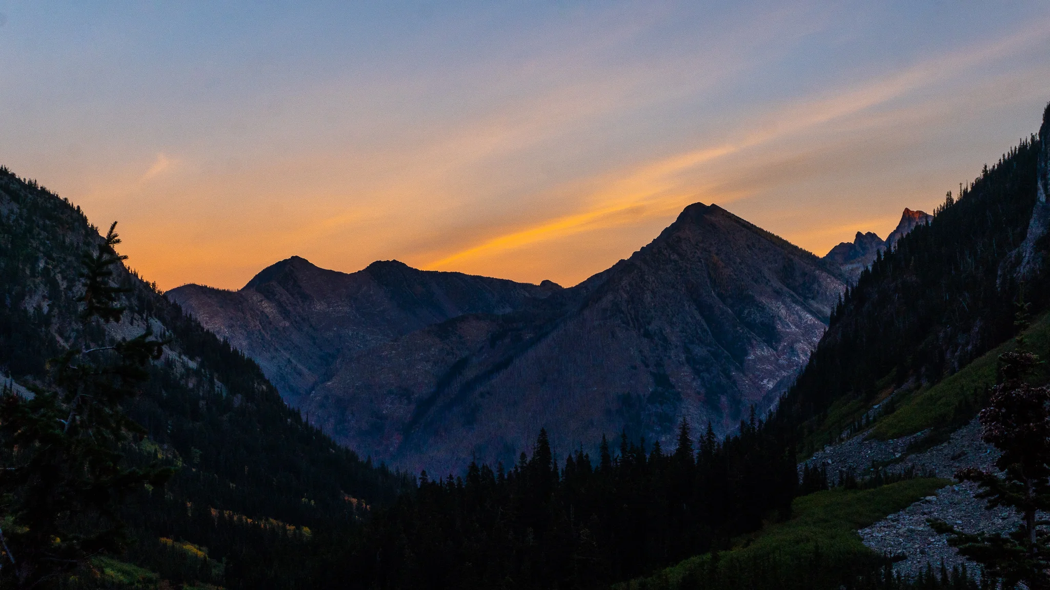 We ate breakfast with some of our camp neighbors and new friends. One guy was from Germany and earned the trail name ‘Water Rope’ after calling a garden hose by the same name because he didn’t know the correct English word. We had a few miles to go until Hart’s Pass which is the last road until Canada and it was also rumored to have a trail magic going on all week. We were all fairly disappointed to arrive to a completely empty road. Sea Lion and I took our first snack break and I checked the trail register but there was no sign of our group. So I signed it with a timestamp to let Midge, Moose, and Pickle Pacer know how far ahead we were. Sea Lion and I hiked up the short incline to the final fire reroute which cuts into the Pasayten Wilderness and drops way down into a beautiful valley before entering tree cover and paralleling Robinson Creek for awhile. Lots of the trail was covered in that good soft mud that felt like walking on pillows but it didn’t cling to your shoes or lead to any slips. Aside from that, most of the 21-mile reroute was pretty boring. There was a newly constructed footbridge that we crossed even though the forgetful builders forgot to take down the “Bridge Under Construction” sign and orange tape. We also realized that the sudden uptick in SOBOs were the unfortunate hikers who did not get permits to enter Canada and had to turn around at the border to hike 28 miles back to Hart’s Pass. One of these souls was my buddy Nemo from the AT. It was great running into him at the last possible moment out on the West cost. The reroute then turns up Rock Creek valley and reconnects with the PCT which stayed up on top of Buckskin Ridge. I began to hustle in hopes to catch sunset from the ridge but we were just too far out. We set camp just under Woody’s Pass and I noticed that we had a good eastward facing view so, with some luck, we could have a spectacular sunrise to start our final day on the trail. We had dinner with some new faces, Brian and Patches, who had been on trail for nearly seven months! They had tons of stories of their freezing and totally snow-covered journey through the Sierras in early April, then taking a week off to go warm up in the San Diego sun. We went to bed and stayed up for a bit reminiscing about the trail and sharing our favorite sections, laughs, and pains. Realizing that it is the last night inside your tent (or hammock) is always a reflection time that brings back an avalanche of memories of the journey and a pinch of sadness knowing that it ends tomorrow.