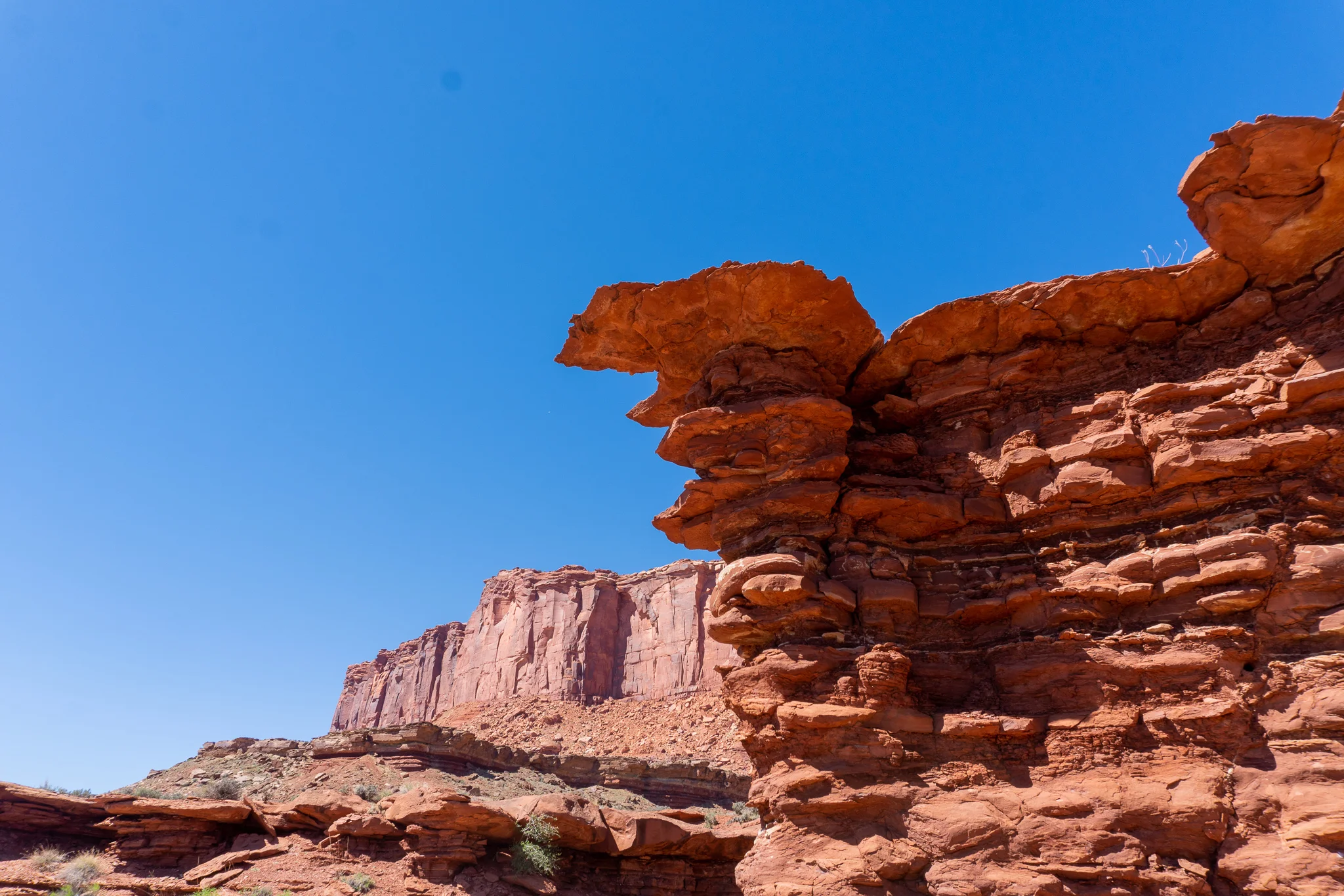 At the bottom of the drop is where the trail divides and the actual loop begins. We went clockwise around the loop so we started hiking in an old river bed which had remarkable layers and overhanging rocks. We passed the remnants of another horse corral and would try to hike on the shaded side of the slot as the turns permitted. The trail links up with the famous offroading White Rim Trail for a bit and we thought that would be a blast to drive someday. There is a super steep climb where Diego luckily found a metal bar at the bottom that he was able to use as a trekking pole to help get him up the ascent. At the top was a well maintained campground for the off-roaders and it served as a great point to take a break, about 7 miles in.