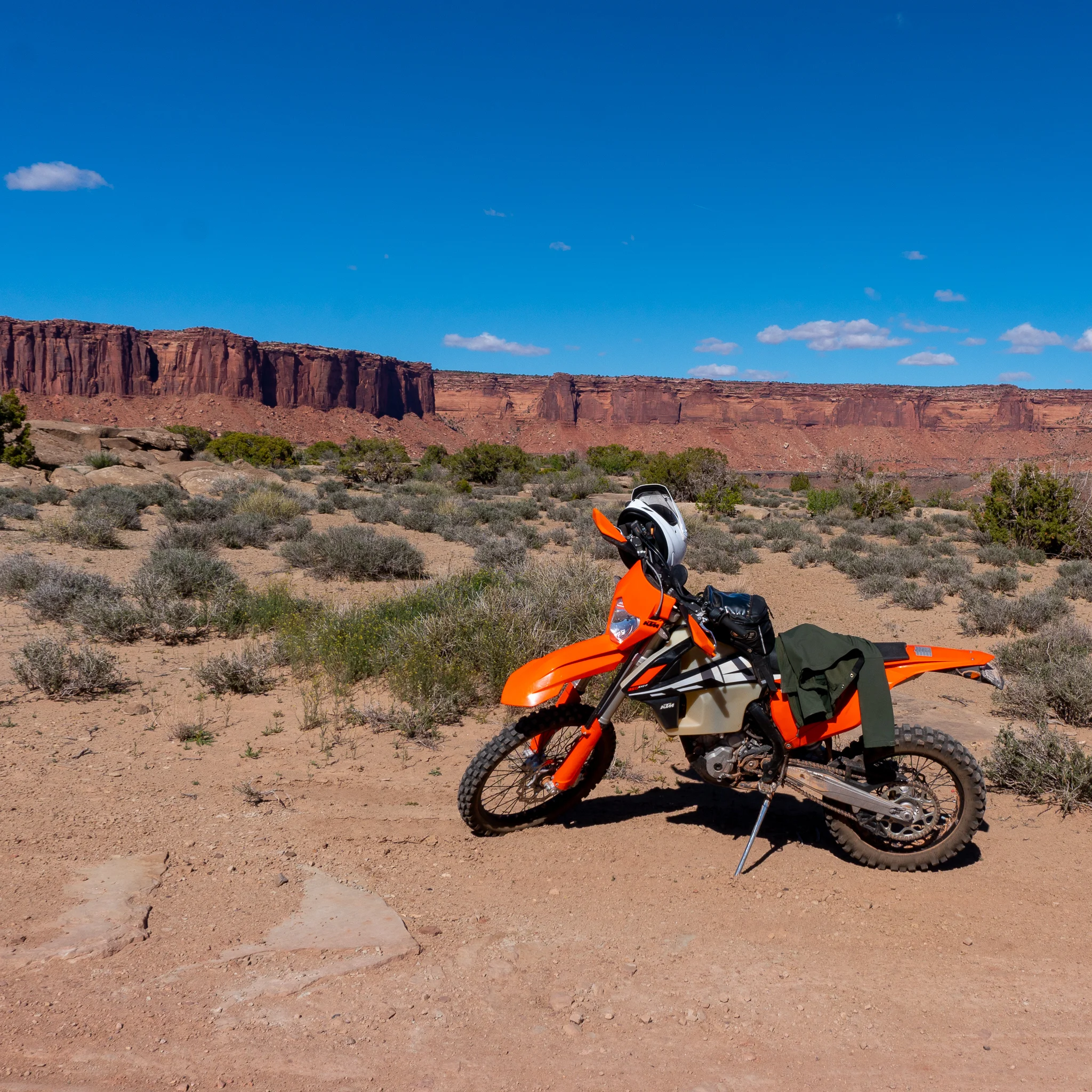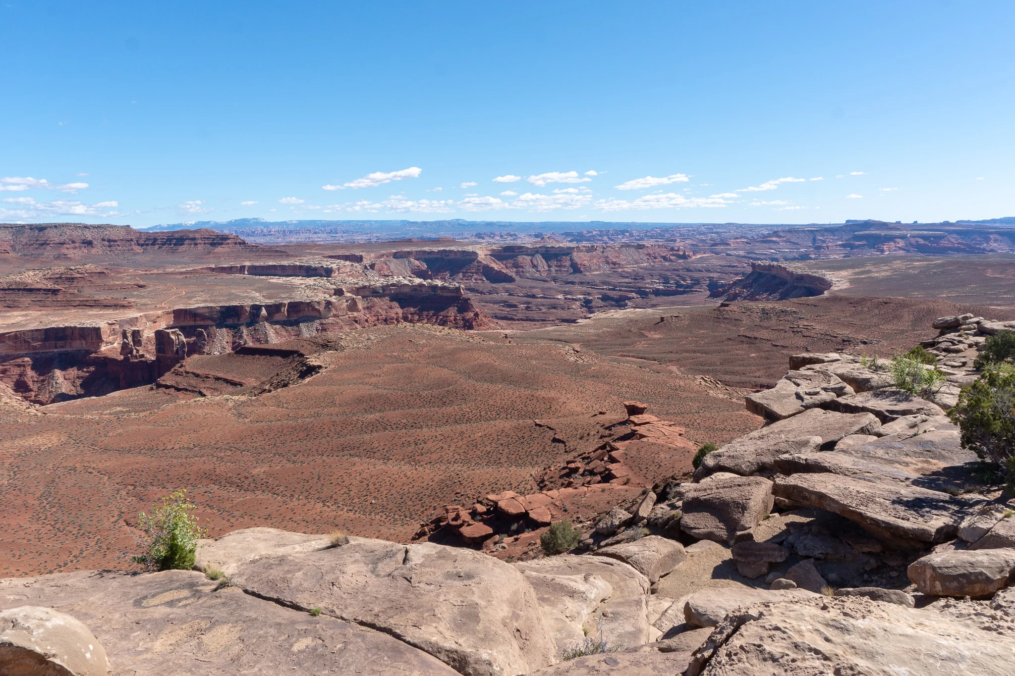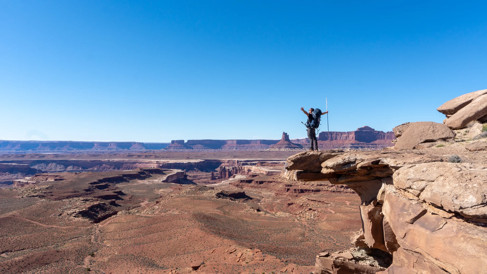 A guy on a dirt bike rolled up and I learned he is a US Park Ranger who gets to patrol the 100-mile long White Rim Trail. That'd be the best job ever! After our socks dried out and we had a snack we continued along to search for a spot to camp. The Murphy Loop stayed on a flat piece of land that had spectacular views of the Green River and Candlestick Tower to the North but it was also fairly windy. I scouted one or two spots that might have been able to support my hammock but, starting off the hike, I knew that chances were high that I would be cowboy camping. We came across a small little side trail which we decided to take and wound up finding the McAfee Knob of the West! It was a big rock outcropping with a pristine and almost fake-looking backdrop which was begging for some photos.